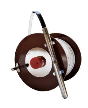 The cable light plumb line consists of a plastic ribbon cable containing two electrically conductive stainless steel wires and a contact in the form of an insulated probe with a 15mm diameter in stainless steel. When this probe touches the water surface, this is indicated on the reel. In addition to the LED, an acoustic signal is given. The white plastic ribbon has cm graduations in black with red numbers for clear reading.