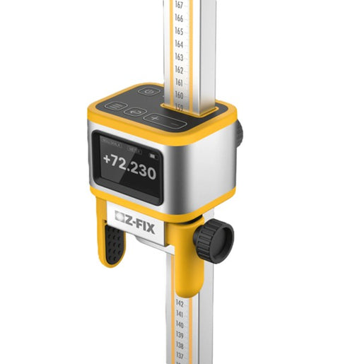 Å bruke Z-FIX sammen med en bygglaser betyr at plushøydene vises direkte, at manuelle beregninger ikke lenger er nødvendige, og at alt utføres enkelt, trygt og raskt. Z-FIX består av en 2,21 meter lang "Z-FIX Hovedstang" og et "Z-FIX Datohode" som du flytter i høyderetning på hovedstangen. På datohodets festebrakett skrur du fast lasermottakeren din. Deretter kalibrerer du Z-FIX mot en kjent fixhøyde og laserplanet. Når fixhøyden er programmert inn, beregner Z-FIX plushøydene automatisk.